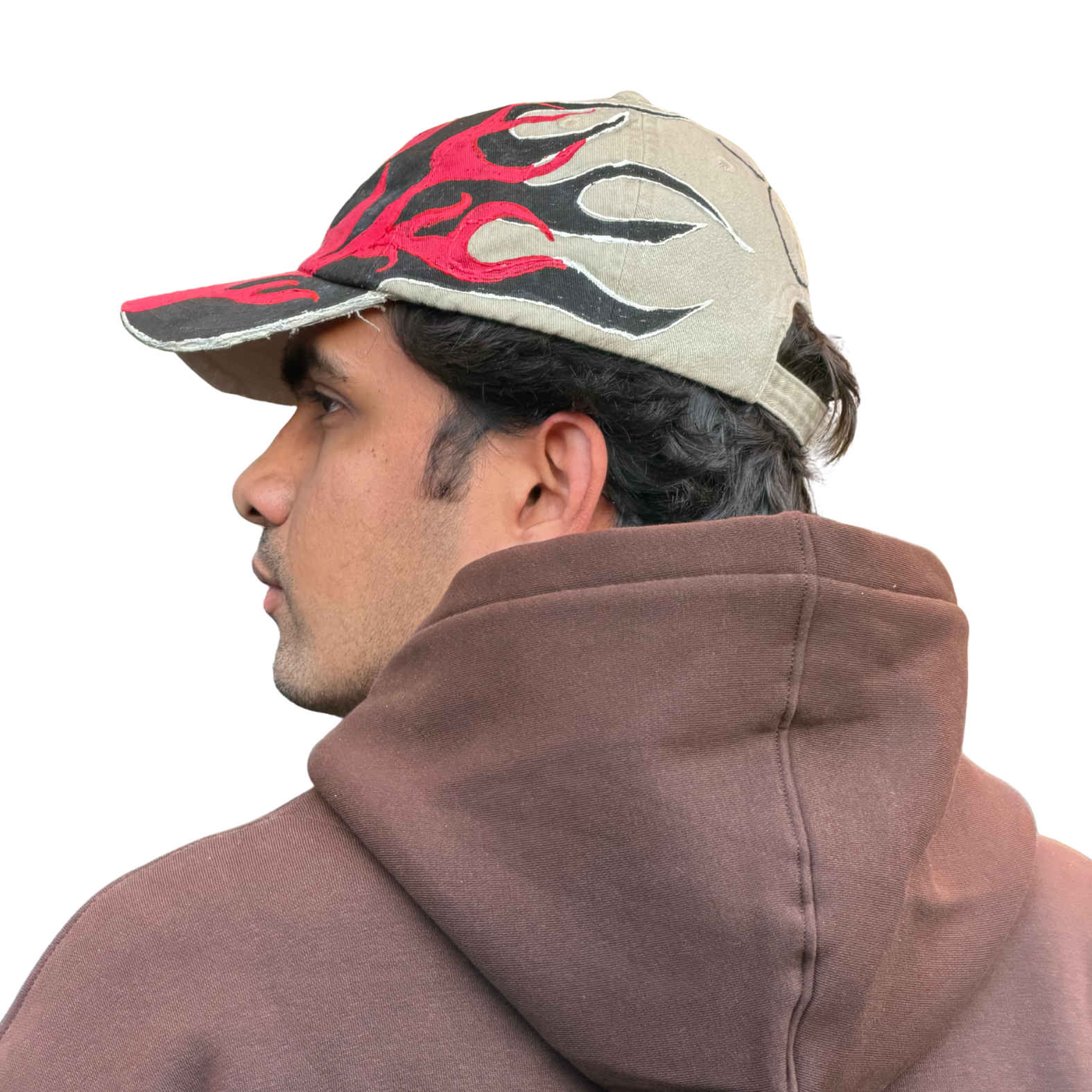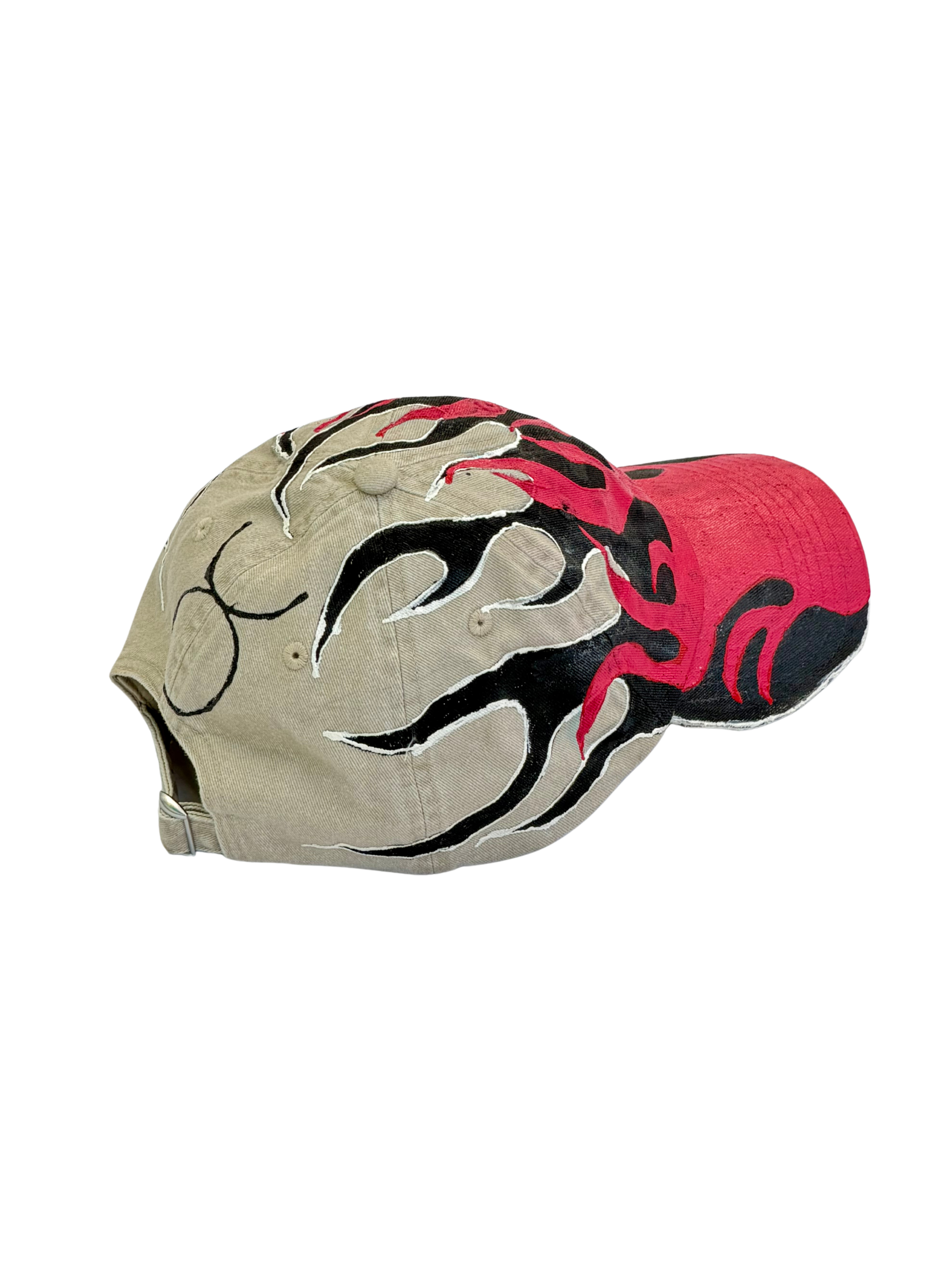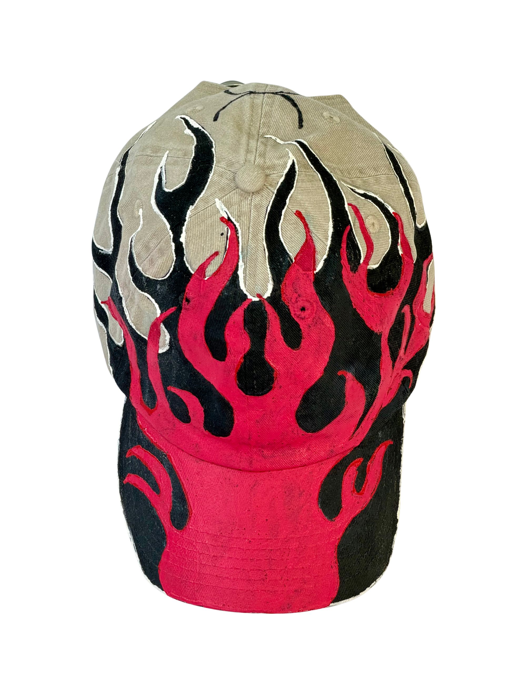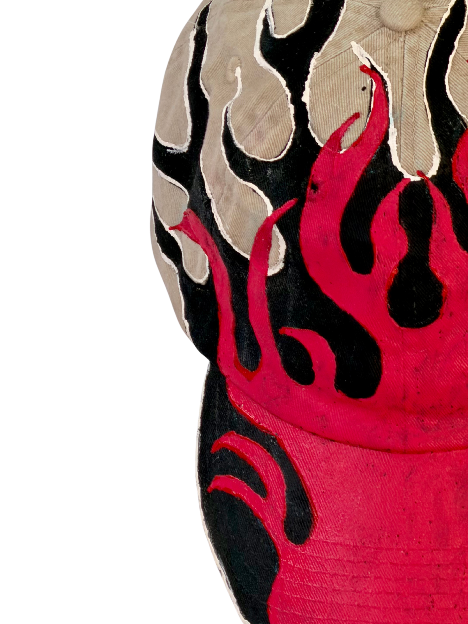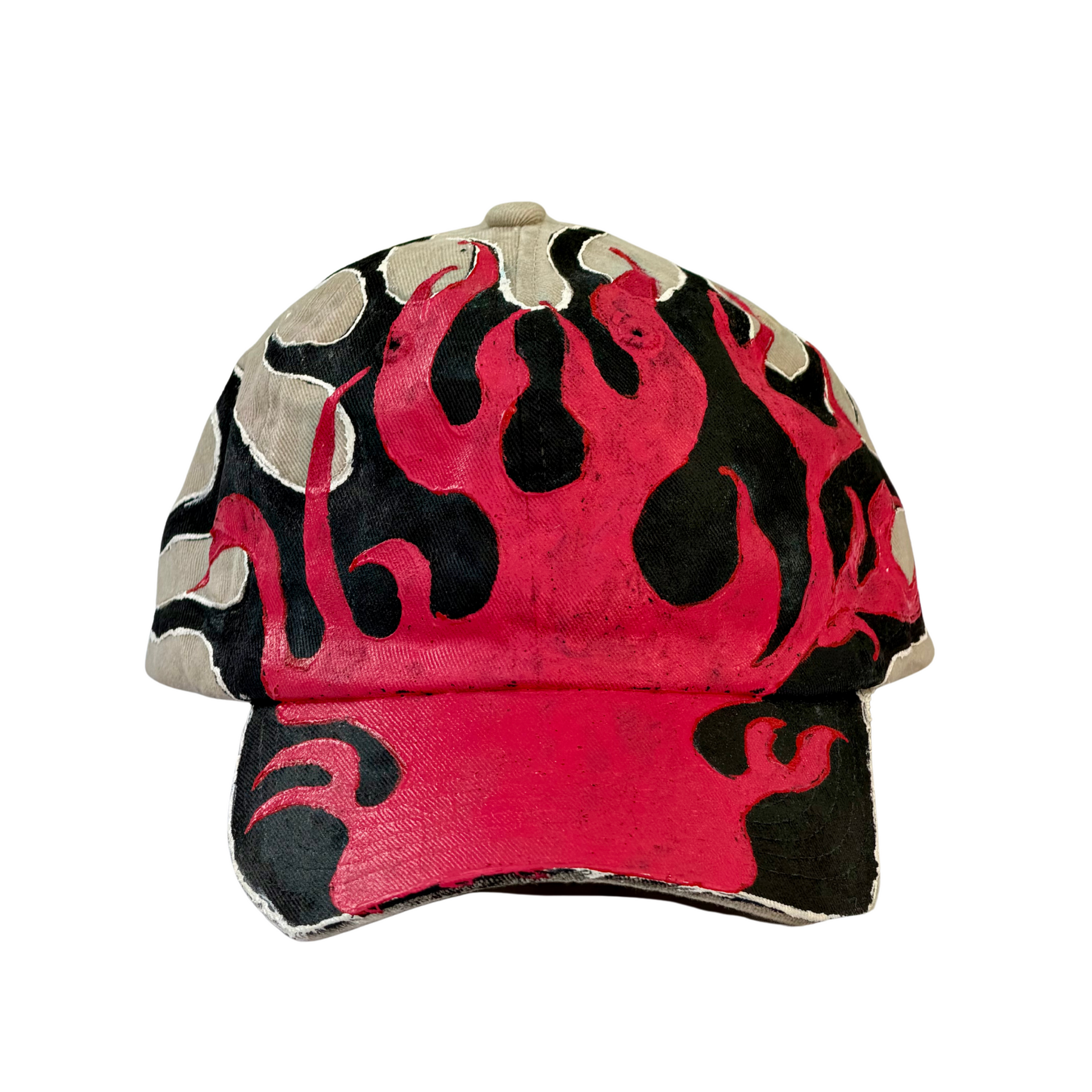The Ignite cap is a wearable manifestation of raw energy. Featuring a high-contrast, hand-painted flame motif, this piece captures the moment of combustion. It is a loud, unapologetic statement of passion, transforming a classic silhouette into a piece of wearable fire.