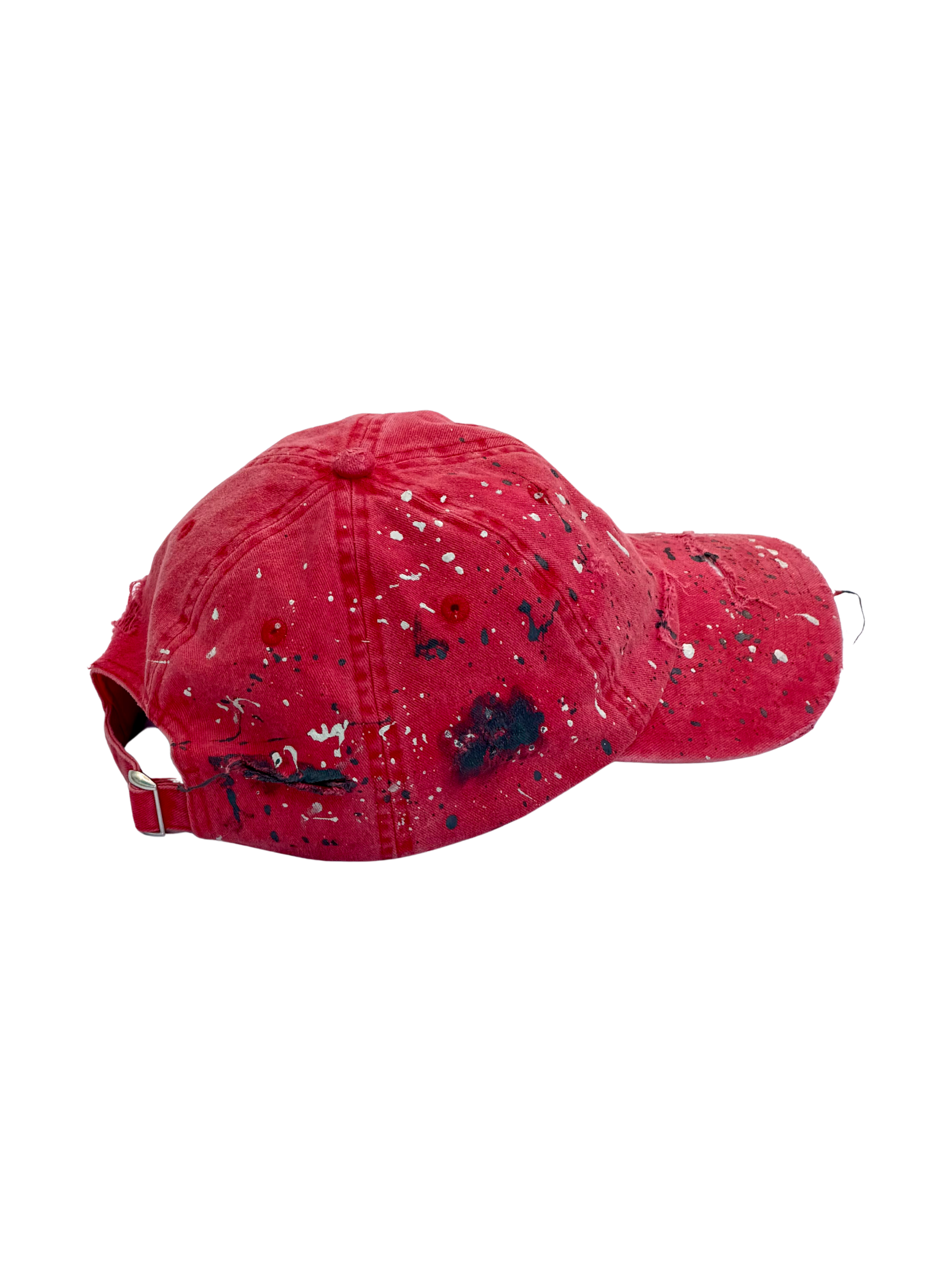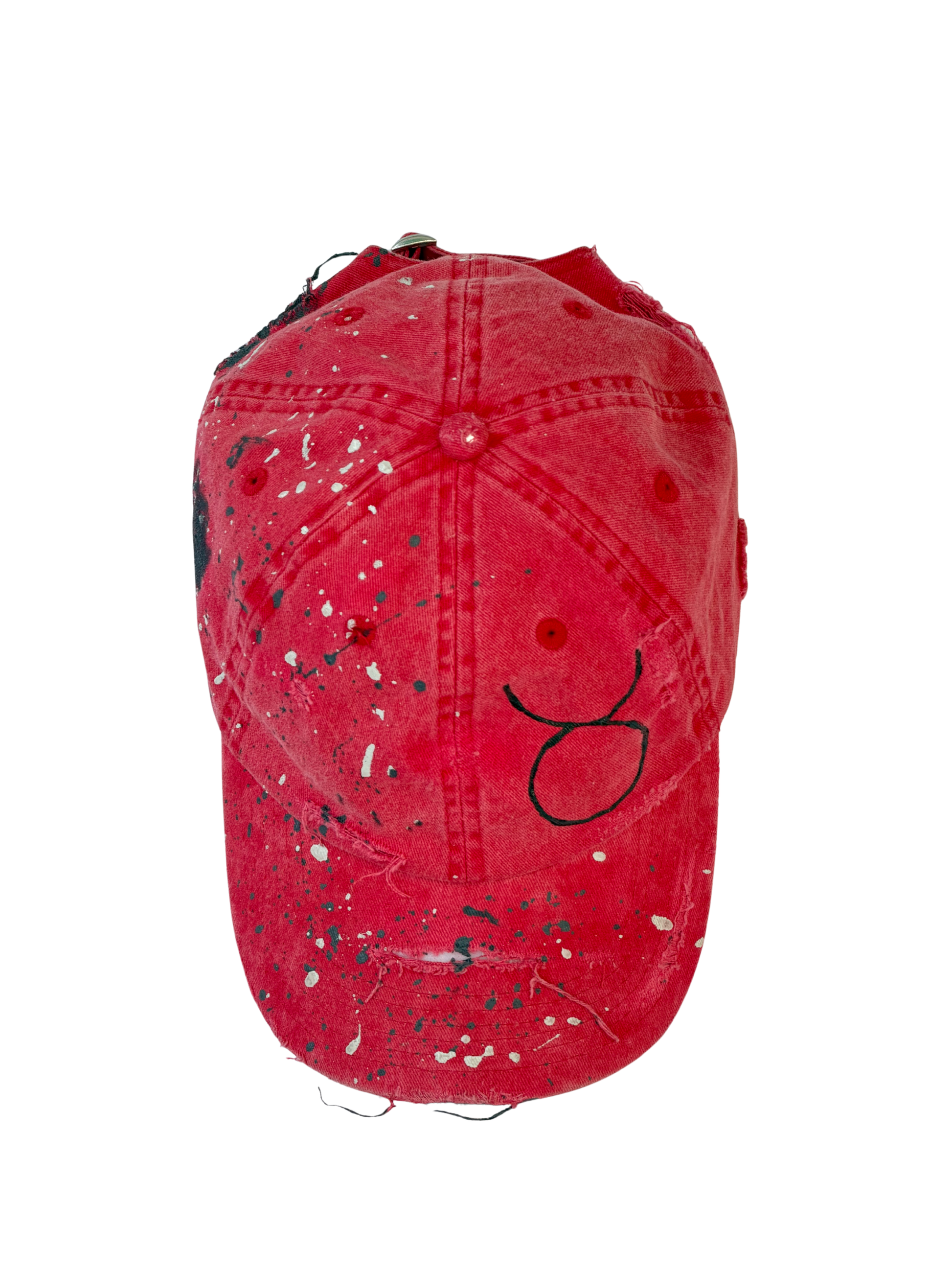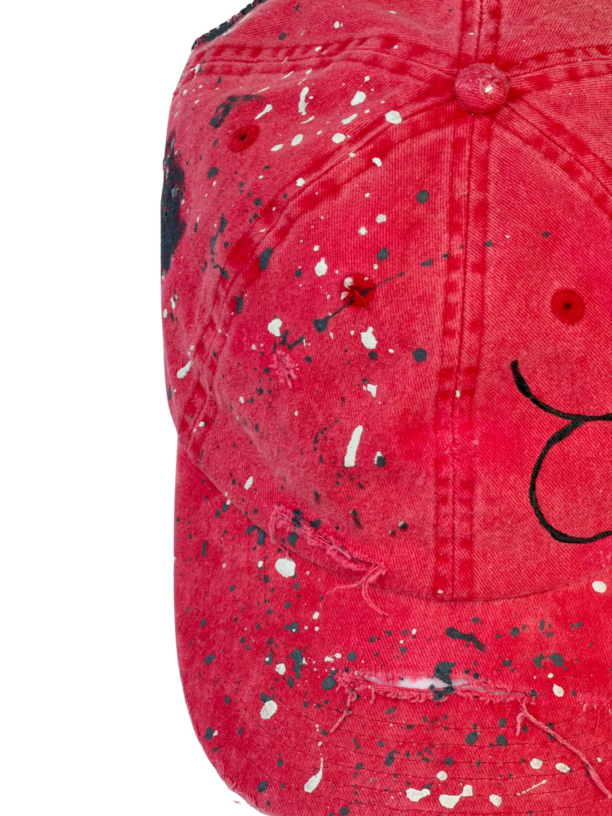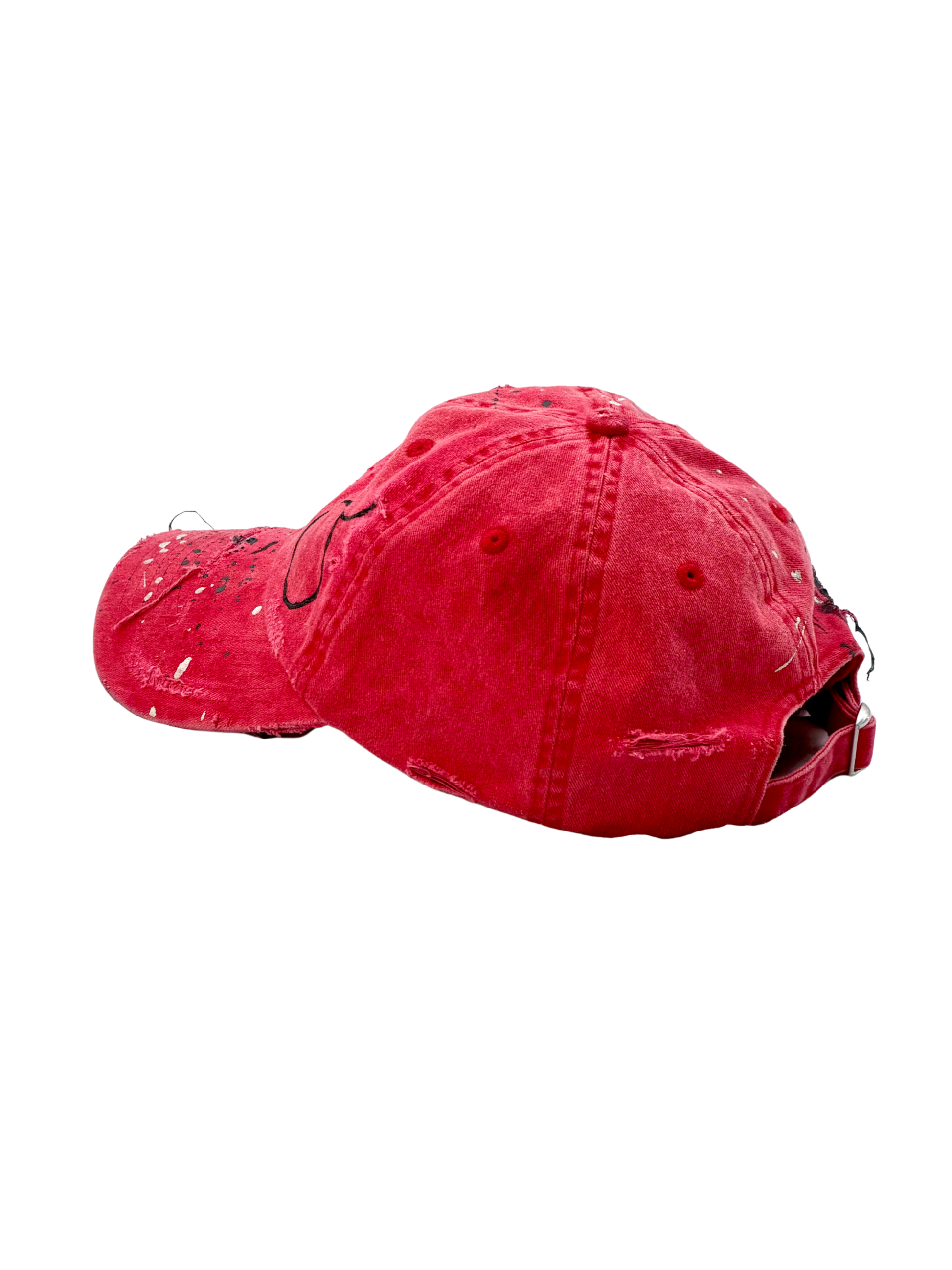 The STATIC cap is a study in visual disruption. Using a sun-faded, "blood-moon" red base, this piece is intentionally weathered to look like an artifact of a long journey. It is a signature piece of wearable art that balances the grit of the street with the precision of a gallery installation.