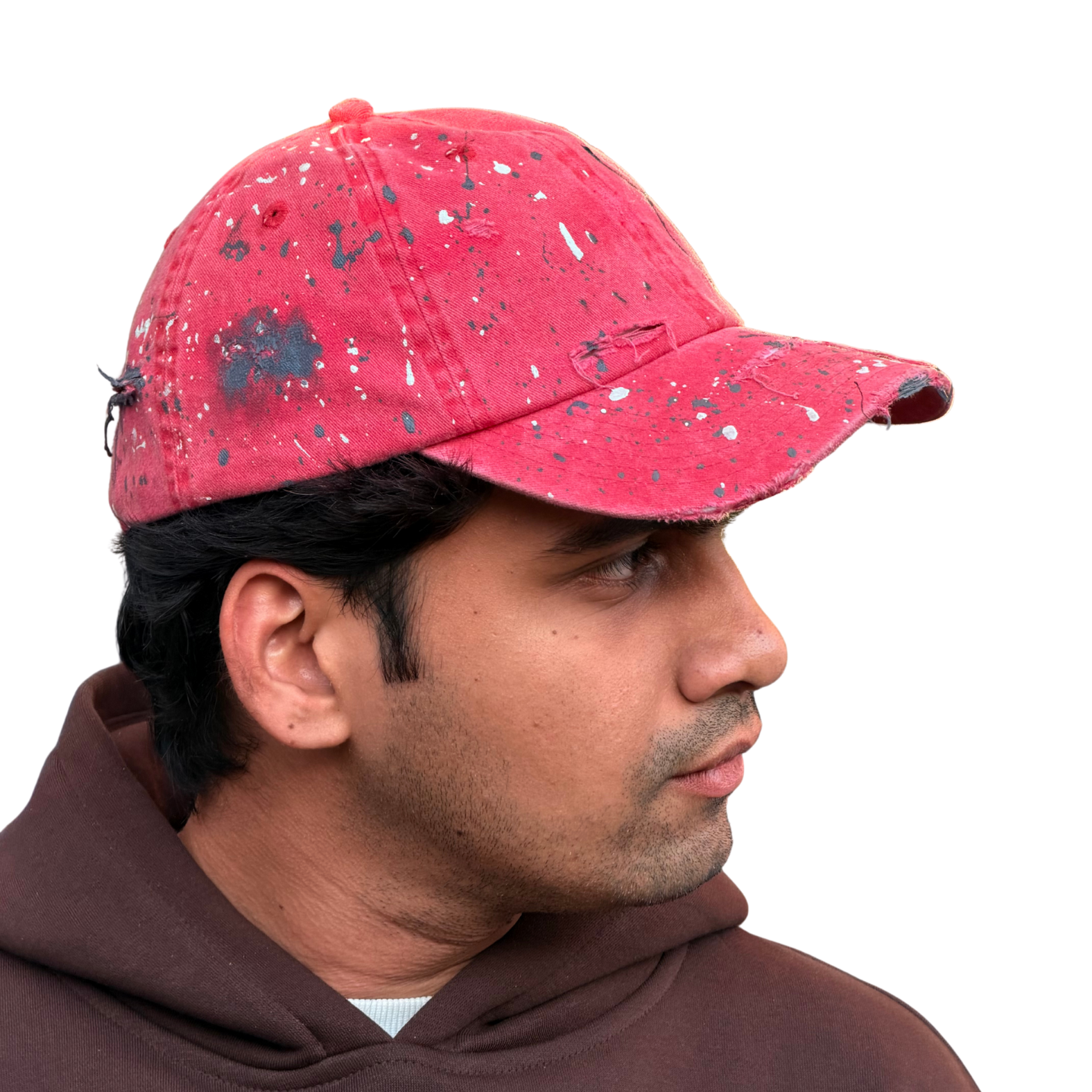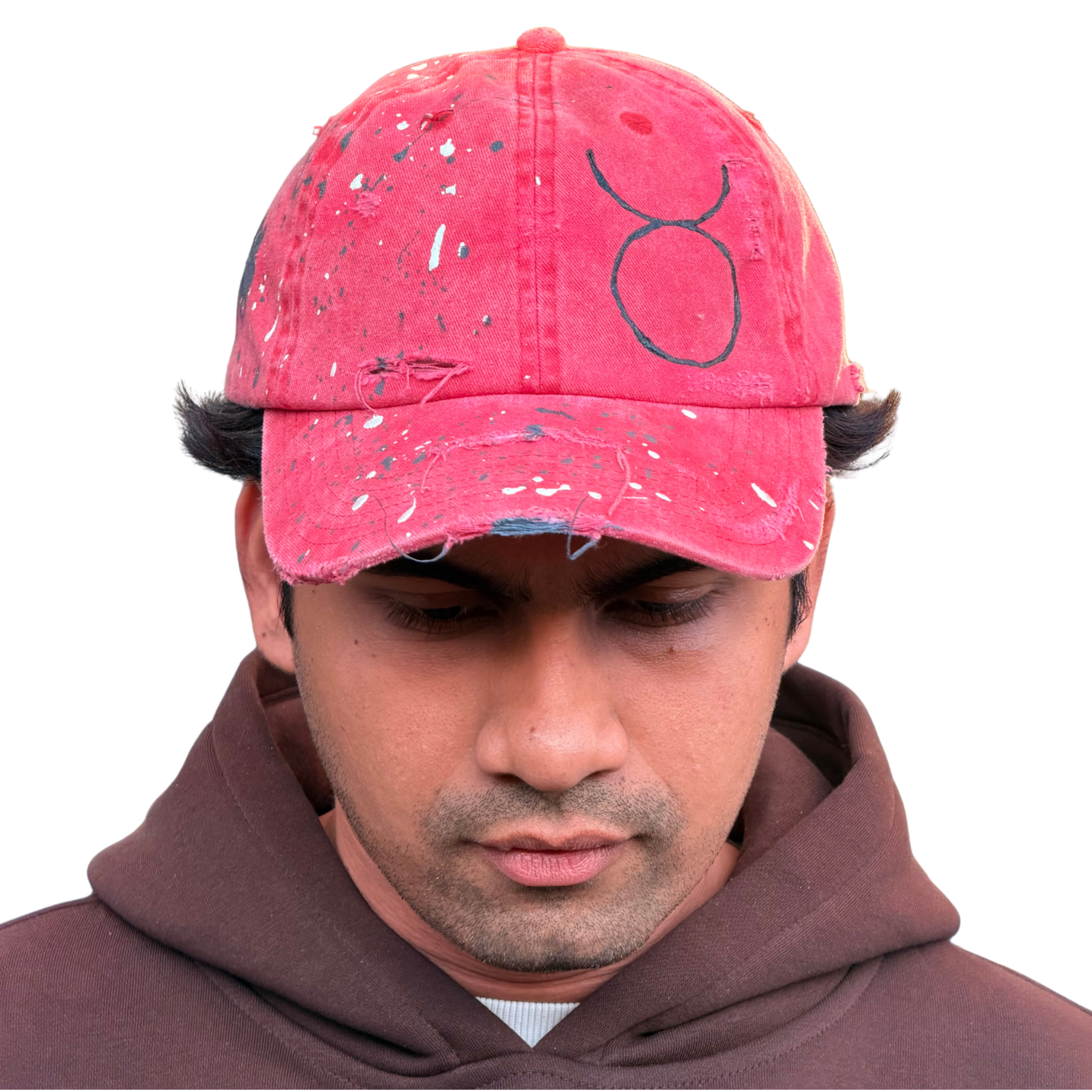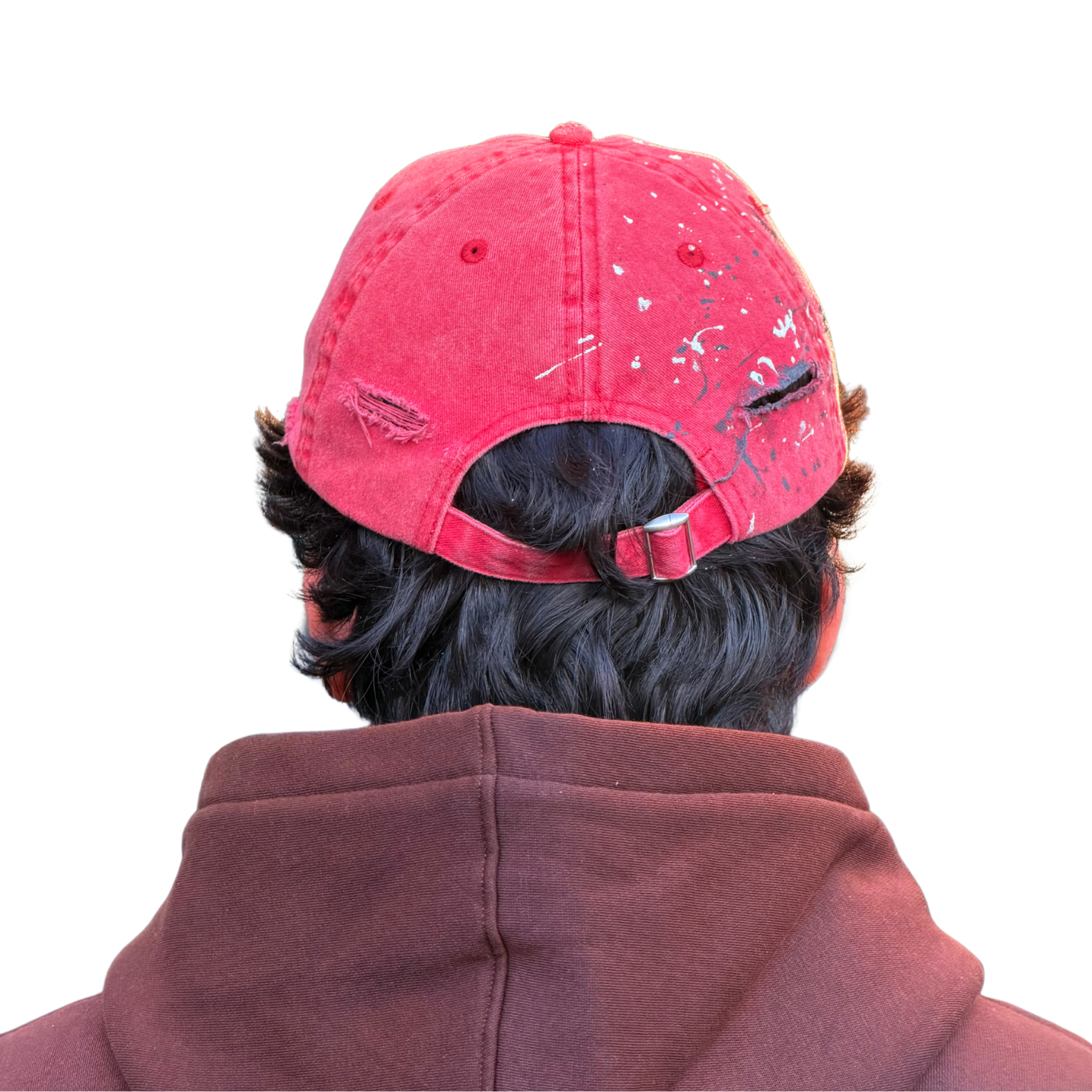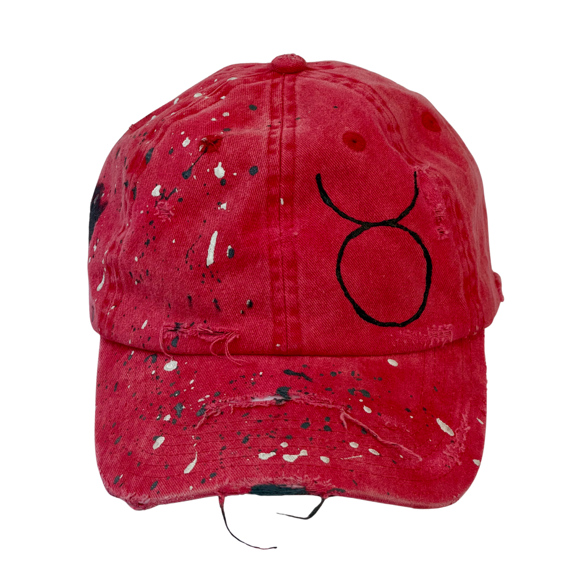 The STATIC cap is a study in visual disruption. Using a sun-faded, "blood-moon" red base, this piece is intentionally weathered to look like an artifact of a long journey. It is a signature piece of wearable art that balances the grit of the street with the precision of a gallery installation.