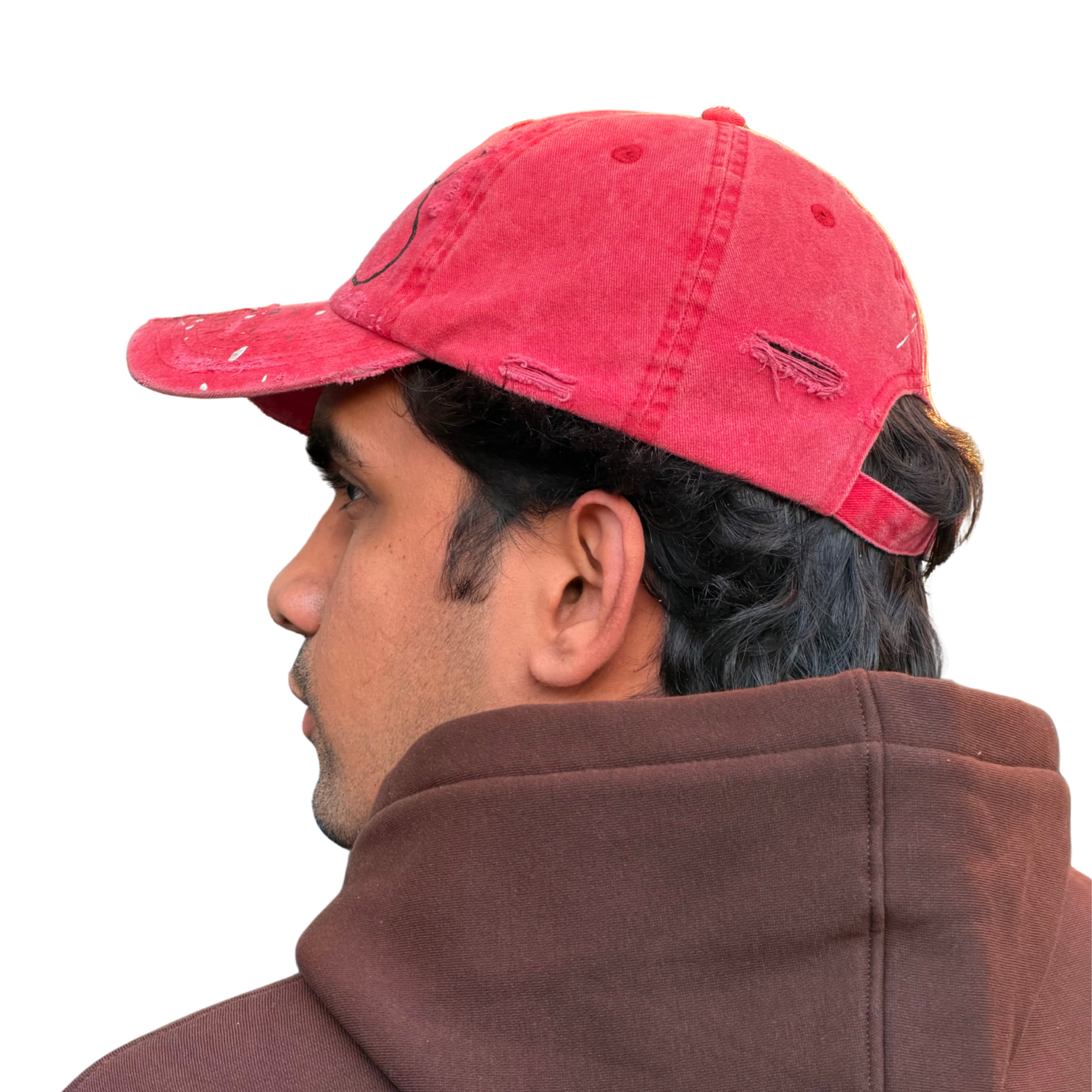 - The Faded Foundation: The deep crimson cotton has been hand-distressed, creating frayed edges and "scars" that give the cap a lived-in, vintage soul.